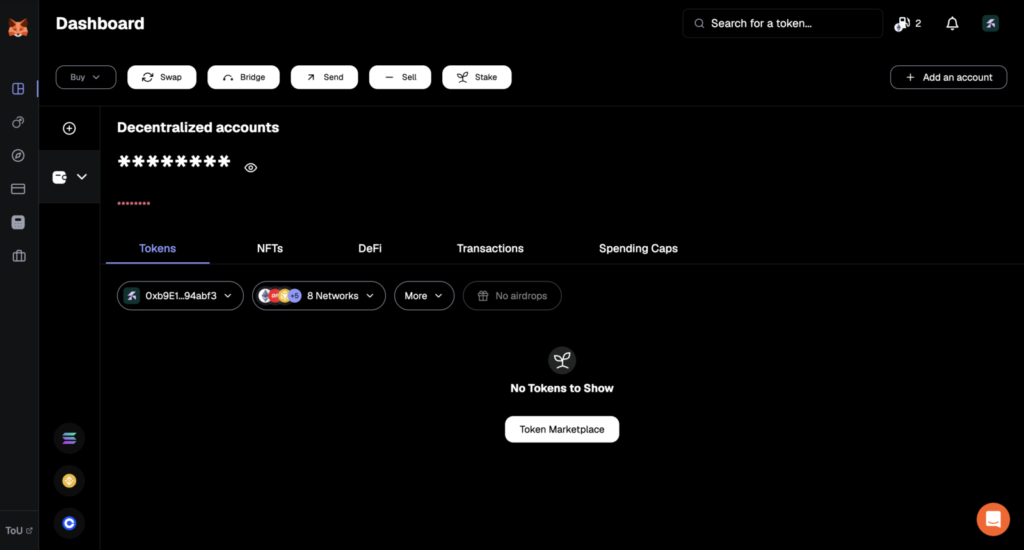 メタマスクのトップ画面。ユーザーのウォレット内にあるトークンやNFTが表示され、さまざまなアプリとの連携を通してシームレスなWeb3体験ができる。また、ウォレット内の資産の変換・運用も可能であるため、Web3初心者から上級者まで幅広く利用されている。