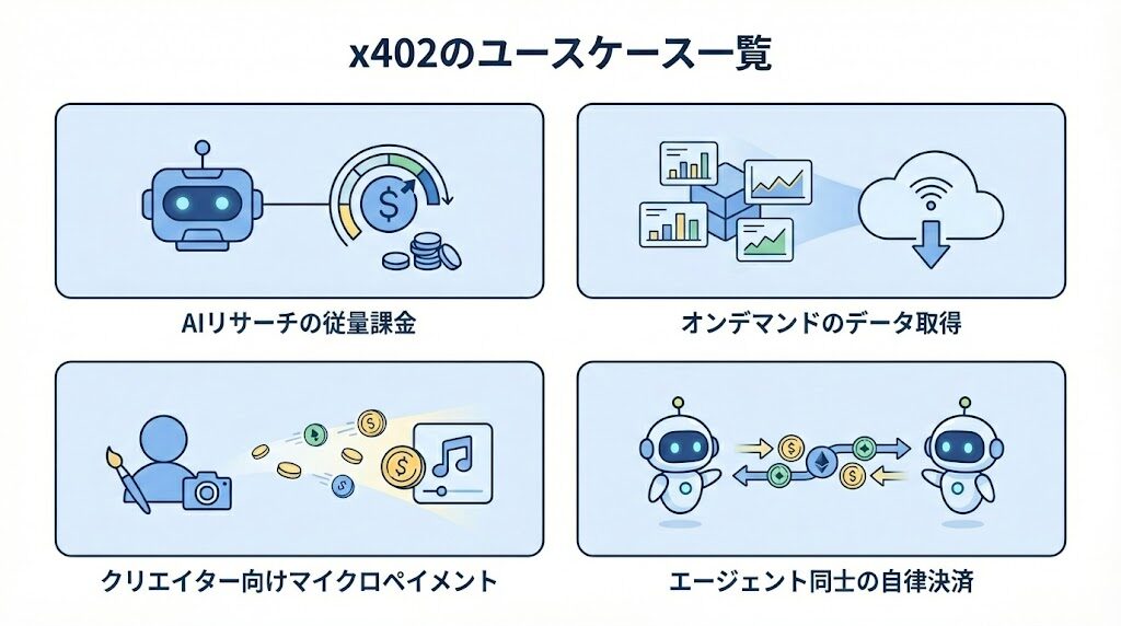 x402はまだ初期段階にあるものの、すでに以下のような領域でユースケースが立ち上がりつつあります。