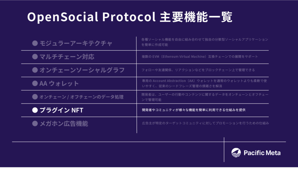 OpenSocial Protocolは、プラグインNFTを活用して、開発者やコミュニティが追加機能を簡単に利用できる仕組みを提供しています。プラグインNFTは、ERC-1155規格に基づいており、以下のような機能を提供するためのライセンスとして機能します。