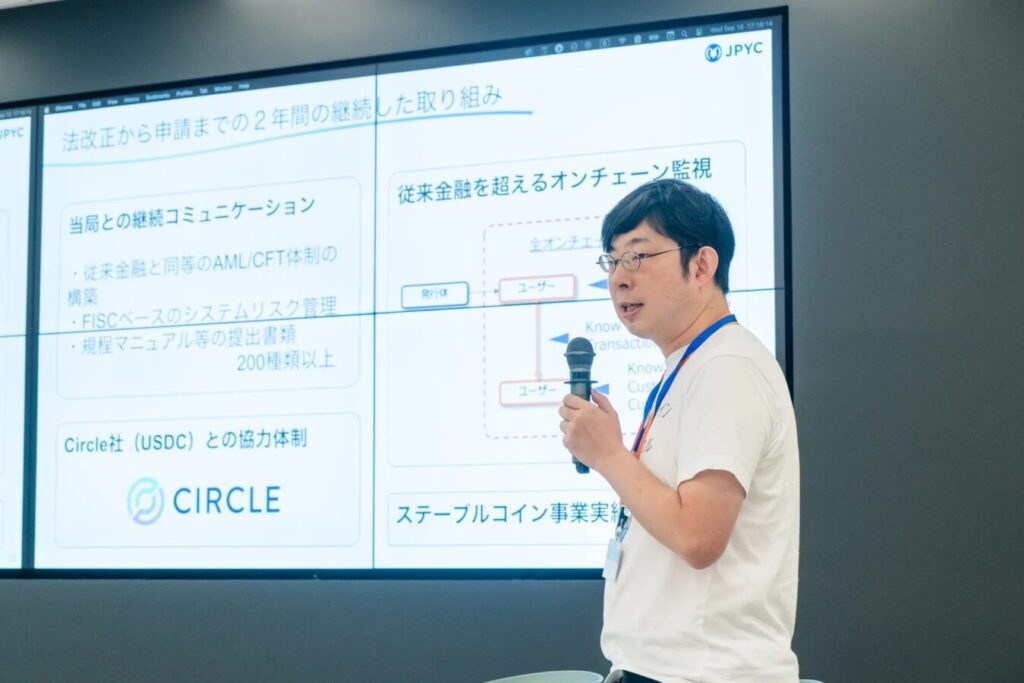 国内初のステーブルコイン発行ライセンスを取得したJPYCの岡部氏は、2019年の設立から約4年半の歩みと、今秋の正式リリースに向けた展望を語った。