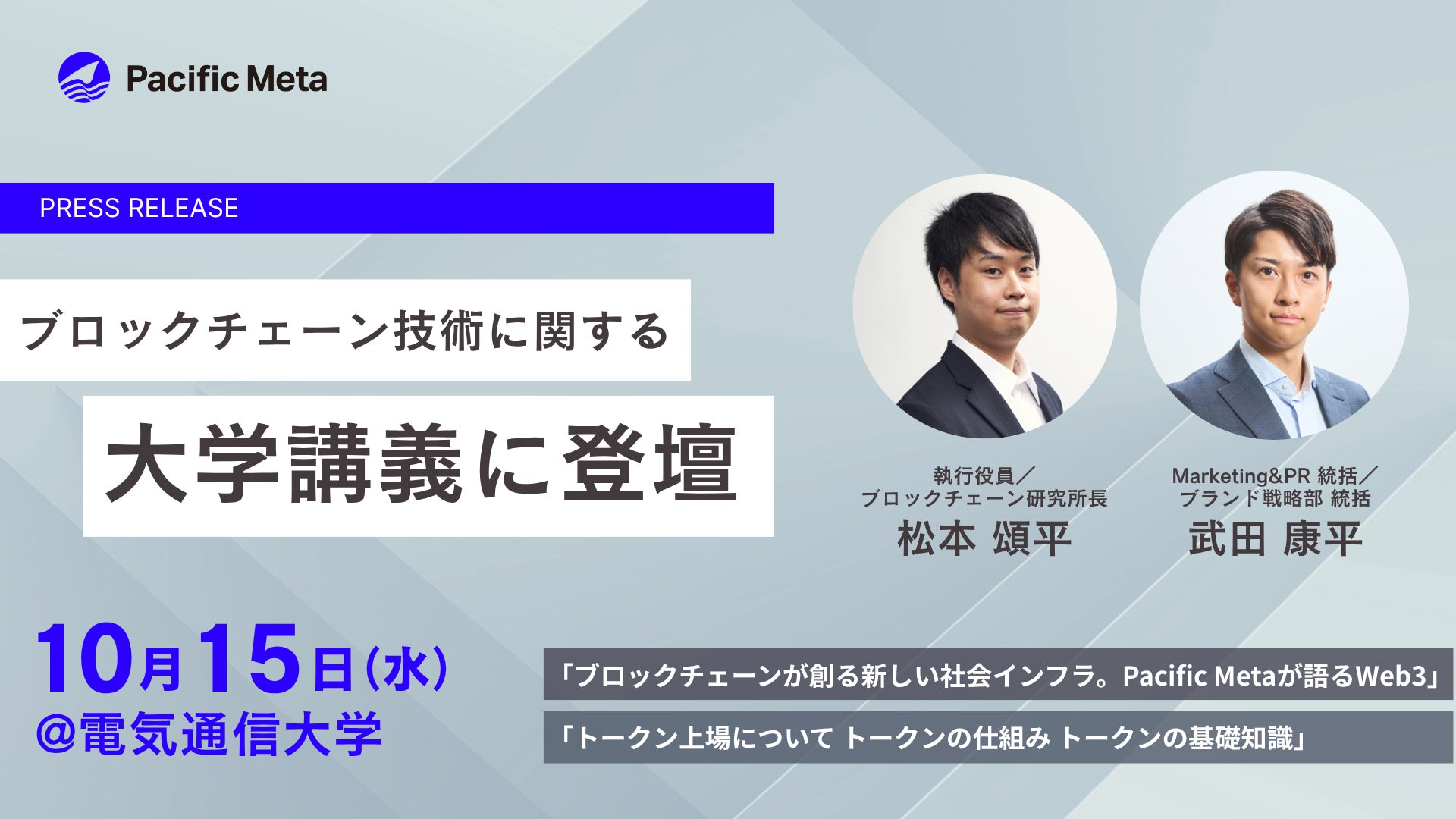 2025年10月15日(水)、株式会社Pacific Meta(本社:東京都渋谷区、代表取締役:岩崎 翔太)は、電気通信大学にてブロックチェーン・Web3分野に関する特別講義を実施します。